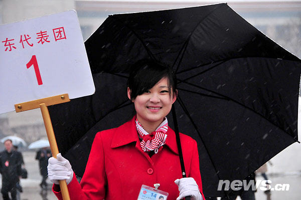 3月14日上午,全国人大三次会议闭幕。当天北京下起小雨夹雪,服务两会的工作人员撑起雨伞,为代表们遮风挡雨。图为服务人员在雪中等待代表返回驻地。新华网 孙巍 摄