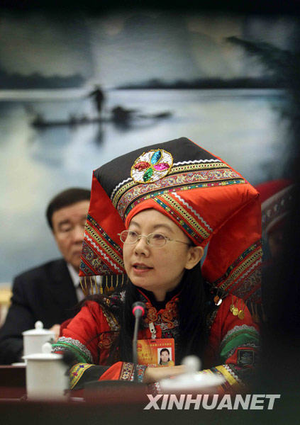 3月10日,全国人大代表、广西良凤江国家森林公园副主任覃建宁(壮族)就环境保护问题发言。新华社记者刘卫兵摄
