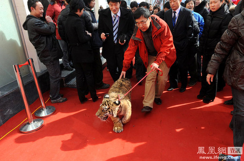3月13日,沈阳某商业广场楼盘开盘仪式,邀请了一只东北虎现场“走秀”,并决定认养这只沈阳怪坡动物园的东北虎一年。由于沈阳冰川动物园刚刚发生11只东北虎相继被饿死事件,人们对这次老虎“走秀”倾注了极大关注。