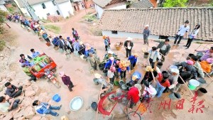 云南省红河哈尼族彝族自治州弥勒县五山乡则居村的彝族群众在排队取水。
