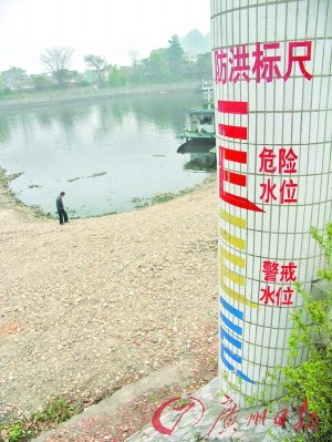 漓江现在的水位离防洪柱的标志最低水位还差很远很远。