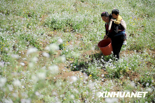 贵州省黔西南布依族苗族自治州普安县白沙乡卡塘村小芹箐组,贺仕琴正背着孩子灌溉菜田(3月5日摄)。新华社记者刘续摄