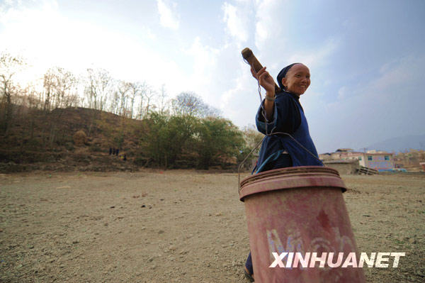 贵州省晴隆县光照镇规模村,一名布依族妇女正挑水回家(3月3日摄)。新华社记者刘续摄