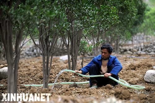 3月23日,在古蔺县马蹄乡椪柑生产基地,一位村民在给椪柑树浇水。自2009年8月以来,干旱已造成四川省泸州市古蔺县24个乡镇近5万户20余万人不同程度受灾。当地群众通过到河里挑水、梯级抽水等措施积极开展抗灾生产自救。新华社记者江宏景摄