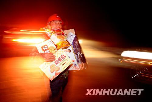 3月28日晚,一名抢险救援人员正在运送食品。新华社记者 燕雁 摄