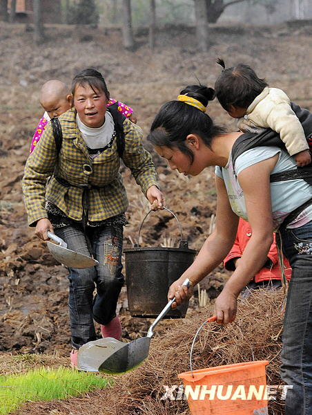 龙潭镇茨德陶家村的两位村民背着孩子下地给稻苗浇水(摄于3月25日)。新华社记者何俊昌摄