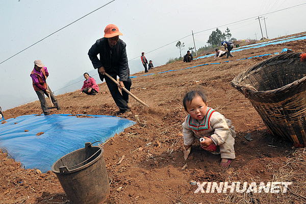 龙潭镇茨德李家村的村民李汶秀(左一)在田里育苗,她的孩子在一旁玩耍(摄于3月25日)。新华社记者何俊昌摄