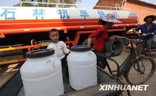 村民在云南省石林彝族自治县鹿阜镇唐家村取水,当地党委政府每天都组织送水车前来送水(3月25日摄)。新华社记者蔺以光摄