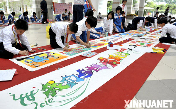 3月30日,广东省中山市石岐中心小学的学生在操场上创作世博主题图画。 当日,中山石岐中心小学100余名学生在操场上挥动画笔,创作一幅幅美丽的画卷,展示他们心目中的上海世博会图景。新华社发(黎旭升 摄)
