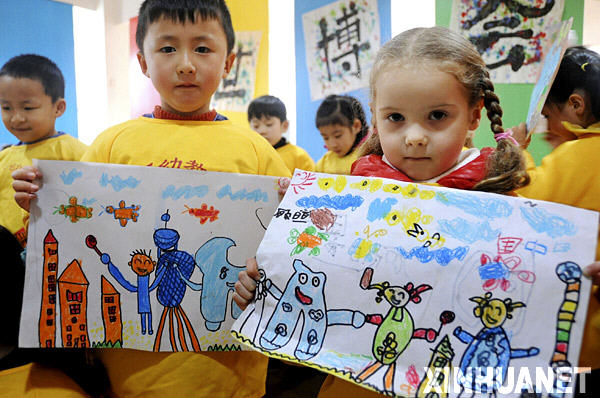 3月30日,江苏连云港市钟声幼教机构久和幼儿园的中外小朋友在展示他们创作的世博主题图画。 当日,连云港市钟声幼教机构久和幼儿园的小朋友在课堂上用画笔、彩色橡皮泥等创作世博主题绘画,展示他们心目中的上海世博会景象。 新华社发