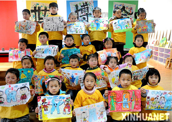 3月30日,江苏连云港市钟声幼教机构久和幼儿园的小朋友一起展示他们创作的世博主题图画。 当日,连云港市钟声幼教机构久和幼儿园的小朋友在课堂上用画笔、彩色橡皮泥等创作世博主题绘画,展示他们心目中的上海世博会景象。 新华社发