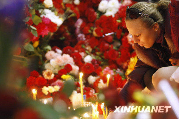 3月30日,在俄罗斯首都莫斯科曾发生爆炸的卢比扬卡地铁站内,一名妇女为地铁爆炸案的遇难者献花并默哀。新华社记者鲁金博摄