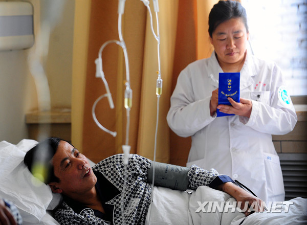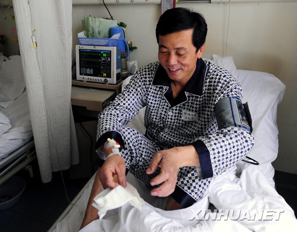 4月7日,龚长中做完检查后,坐起来活动筋骨。新华社记者范敏达摄