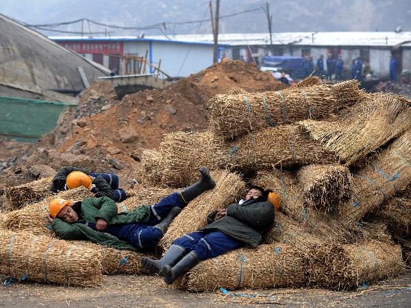3月30日,连续奋战了一个通宵的救援人员在井口附近小憩。新华社记者 燕雁 摄