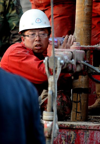 4月2日,在垂直钻孔2号孔,一名救援人员通过钻杆倾听井下被困人员传来的信号。新华社记者 燕雁 摄