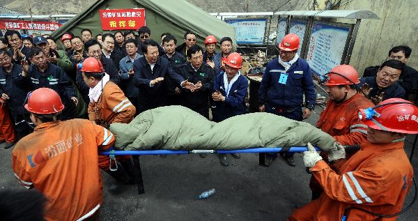 4月5日,救援人员将一位幸存者抬出井口。新华社记者 燕雁 摄