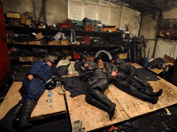 4月4日,几名救援人员和衣而卧,随时准备下井搜救。新华社记者 燕雁 摄