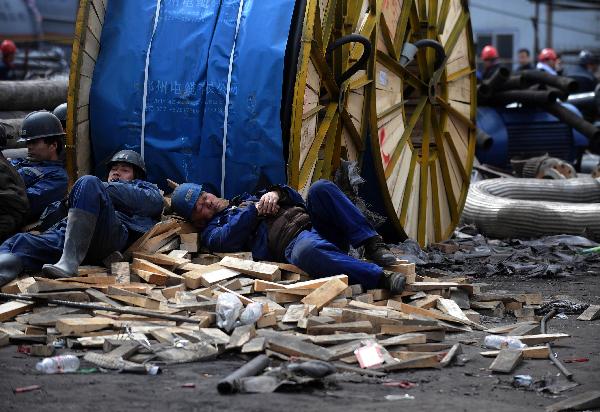 4月3日,几名救援人员在井口附近小憩,随时准备下井。新华社记者 燕雁 摄