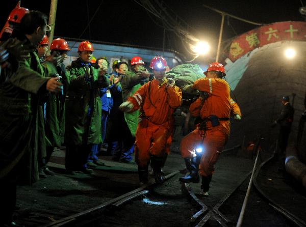 4月5日凌晨,救援人员将一名幸存的矿工抬出井口。新华社记者 燕雁 摄