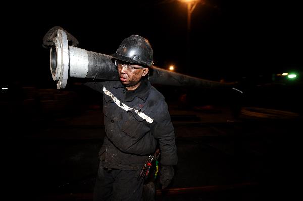 3月29日凌晨1点,一名救援人员在往井下运送排水管。新华社记者 燕雁 摄