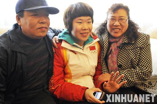 4月3日,周洋(中)与父母合影。当日,中国短道速滑队队员周洋飞抵长春,这是她在温哥华冬奥会夺得两枚金牌后首次返回家乡。新华社记者王昊飞摄