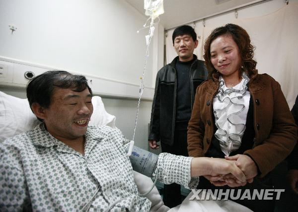 4月9日,在太原山西医科大学附属第二医院,王家岭矿难获救矿工梁进军(左)的未婚妻张粉瑜在众人面前害羞地拉起未婚夫的手。新华社记者 任正来 摄