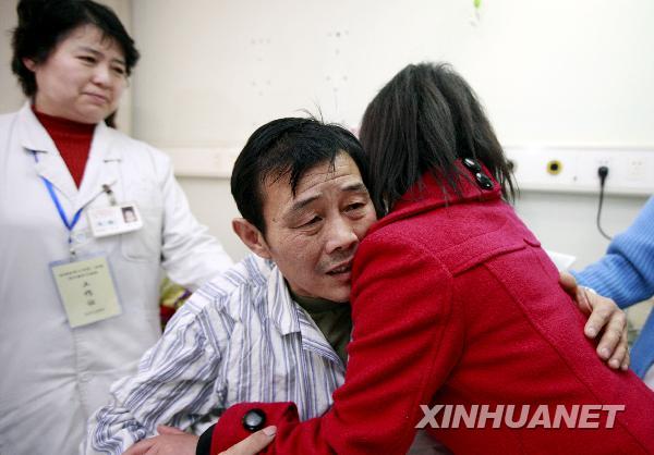 4月9日,在太原山西医科大学附属第二医院,王家岭矿难获救工人湖北籍的魏合荣与女儿拥抱在一起。新华社记者 任正来 摄