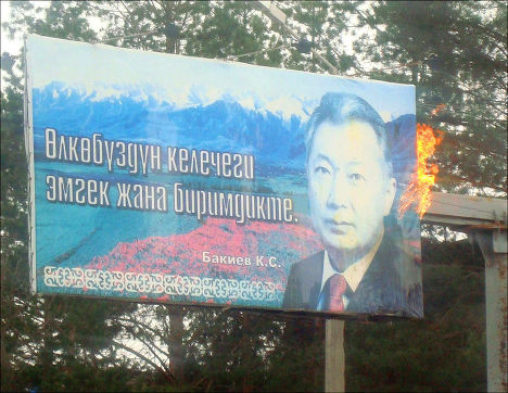 吉尔吉斯斯坦7日发生骚乱。图为被点燃了有总统肖像的宣传画。来源:俄罗斯新闻网