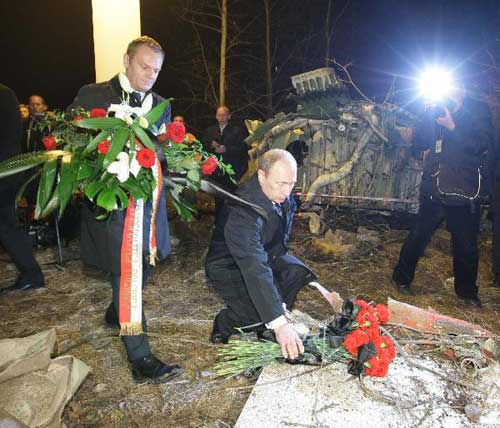 4月10日,在俄罗斯斯摩棱斯克的波兰总统专机失事现场,俄罗斯总理普京(前右)和波兰总理图斯克(前左)敬献鲜花,向遇难者表示哀悼。