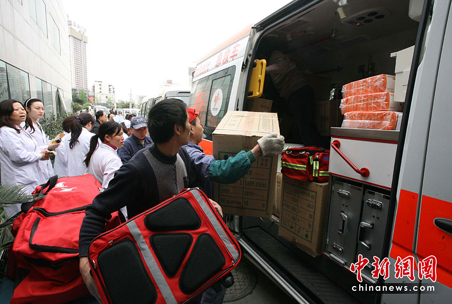 图为4月14日下午,由四川省医院、华西医院23人组成的医疗救援队紧急赶赴青海省玉树县地震灾区参与医疗救援。中新社发 刘忠俊 摄大地的伤口——玉树震后24小时图片实录