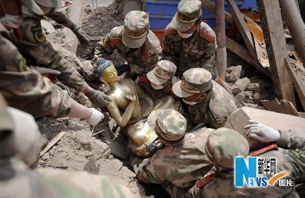 4月19日,武警官兵从禅古寺的废墟中抢救佛像。新华社记者 聂建江摄