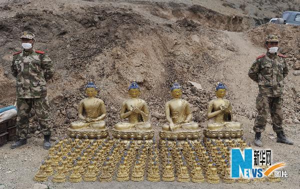 4月19日,武警战士看守着从禅古寺废墟中搜寻的文物。新华社记者 江宏景摄