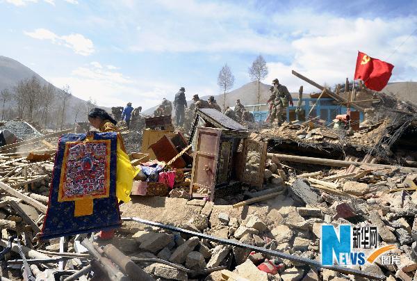 4月19日,索南求藏从废墟里挖出了唐卡。 15岁的藏族女孩索南求藏是玉树当地一所学校的一名初三学生,地震发生当天,逃过一劫的她跟乡亲们第一时间投入救灾工作。索南求藏家的房子在地震中没有倒塌,但她爷爷的家却成为了废墟,受伤的爷爷已被送到医院治疗。地震后的几天里,索南求藏坚持跟救援人员一起清理废墟,整理爷爷家残存的物品。她希望等爷爷康复之后,还能看到他曾经供奉在佛堂里的一幅幅唐卡,还有那些留下岁月痕迹的旧家具。新华社记者 普布扎西 摄