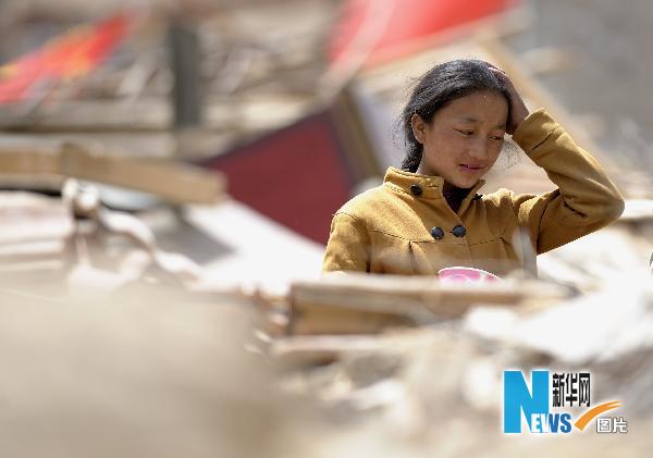 4月19日,索南求藏在废墟里寻找残存物品。 15岁的藏族女孩索南求藏是玉树当地一所学校的一名初三学生,地震发生当天,逃过一劫的她跟乡亲们第一时间投入救灾工作。索南求藏家的房子在地震中没有倒塌,但她爷爷的家却成为了废墟,受伤的爷爷已被送到医院治疗。地震后的几天里,索南求藏坚持跟救援人员一起清理废墟,整理爷爷家残存的物品。她希望等爷爷康复之后,还能看到他曾经供奉在佛堂里的一幅幅唐卡,还有那些留下岁月痕迹的旧家具。新华社记者 普布扎西 摄