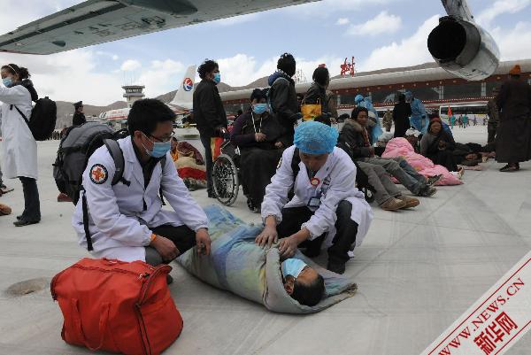 4月19日,救援人员在玉树巴塘机场转运伤员。新华社记者何俊昌 摄