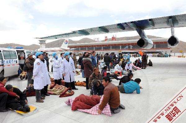 4月19日,伤员在玉树巴塘机场等待转运。