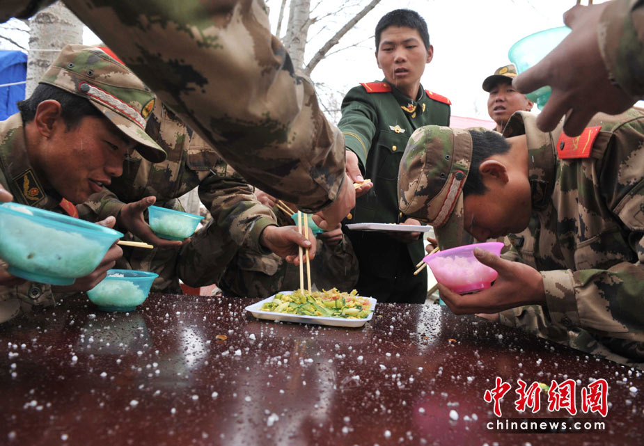 4月20日中午时分,玉树地震灾区突然雷雹交加,正在现场救援的青海武警总队官兵只能在冰雹中吃午餐。中新社发 贾国荣 摄