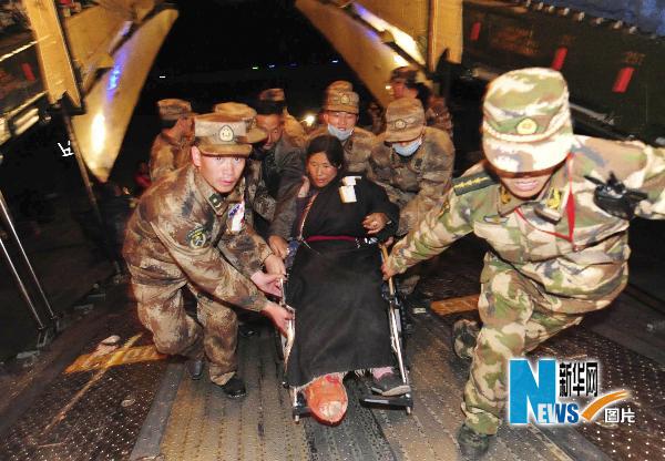 4月20日晚,救援人员将伤员抬上飞机。新华社发(沈玲 摄)
