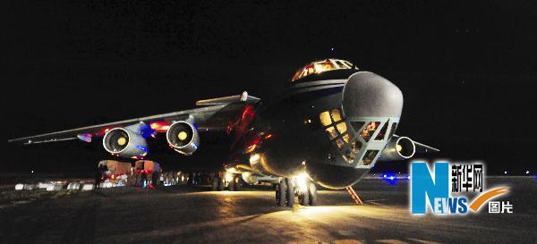 4月20日晚,空军伊尔-76运输机在玉树机场安全降落。新华社发(沈玲 摄)
