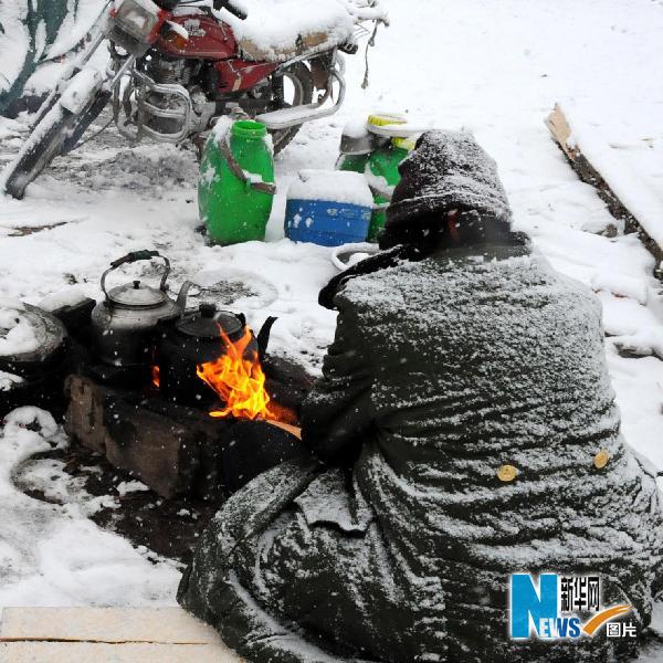 4月22日,在玉树结古镇一处灾民安置点,群众在生火做饭。新华社记者朱祥摄