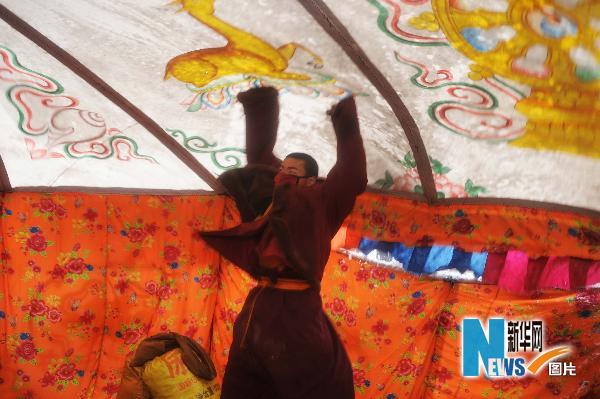 4月22日,在结古镇牦牛广场的帐篷里,来自四川甘孜州石渠县江玛佛学院的喇嘛拍打帐篷清理积雪。当日,青海玉树地震灾区出现降雪天气。新华社记者刘杰摄