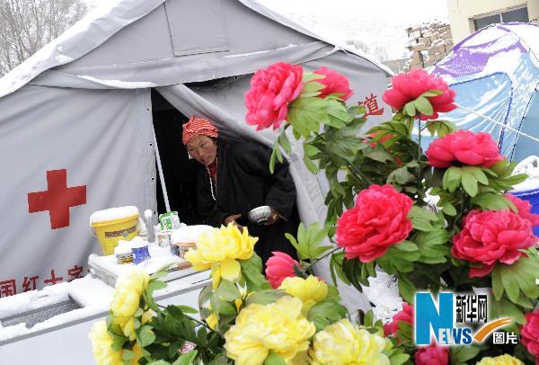4月22日早晨,藏族妇女桑曲走出救灾帐篷,门口的塑料鲜花还没积起雪花,那是她的丈夫刚刚从家中的废墟挖出来的,他们说放在门口可以让生活充满希望。当日,青海玉树地震灾区出现降雪天气。新华社记者郭磊摄