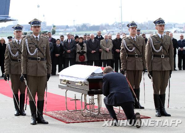 4月11日,在波兰首都华沙,波兰总理图斯克(前中)向总统卡钦斯基的灵柩致敬。当日,波兰总统卡钦斯基的遗体运抵华沙,在机场至总统府的道路两旁,许多民众手持鲜花,默默伫立,目送总统灵柩经过。 新华社/法新