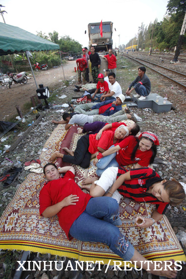 “红衫军”自21日开始连续两天阻塞孔敬府通往首都曼谷的铁路,已经拦截了一列向南方运送军用物资的火车。新华社/路透