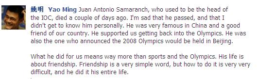 姚明更新博客缅怀萨翁 盛赞他为中国奥运贡献巨大