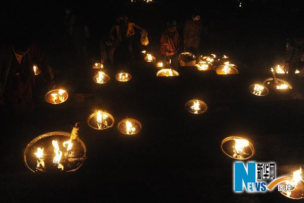 4月24日,藏族群众在赛马场的看台上点燃酥油。新华社记者 郭磊 摄