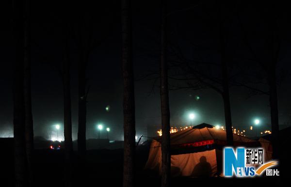4月24日,赛马场受灾群众安置点的一个帐篷里闪烁着灯光。新华社记者 费茂华 摄