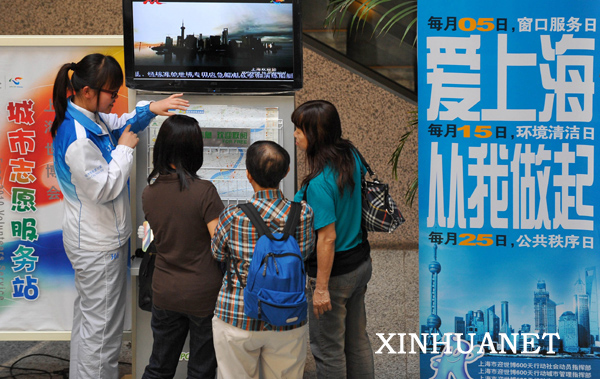 4月29日,一名志愿者在上海博物馆里的城市志愿服务站回答游客问题。据介绍,中国2010年上海世博会将有7万多名园区志愿者和近10万名城市志愿服务站点志愿者为参展方、媒体记者和观众提供专业、优质的服务。新华社记者罗晓光摄