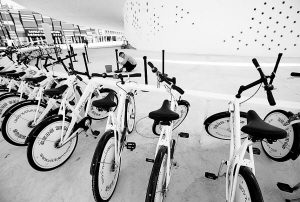 一名清洁工在上海世博园丹麦馆外打扫卫生。在这儿,您可以骑自行车节约体力。