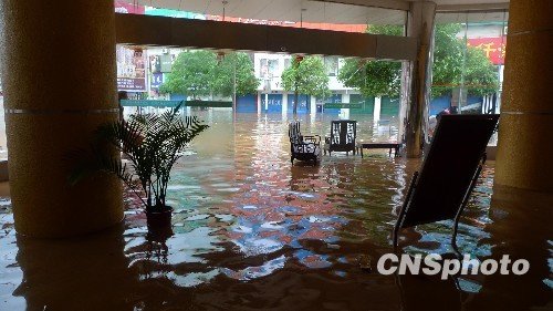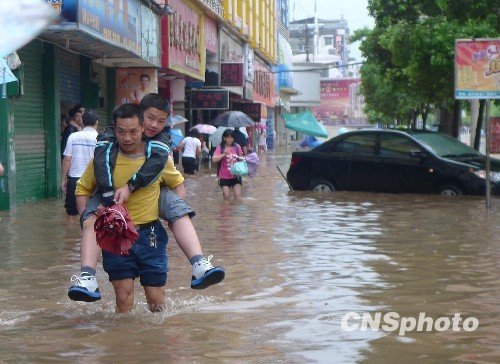 6日,受强降雨影响,湖南新化县城区宽阔的街道已经变成了汹涌的河面,很多市民为了赶着上班、上学,冒险涉水通过。一些汽车因为发动机进水,抛锚停在道路上。 中新社发 肖前辉 摄